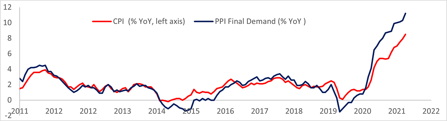US headline CPI inflation may have peaked, but pipeline pressures remain, with yesterday’s March PPI showing a 1.4% increase on the month – three tenths above estimates while the core rate excluding food and energy rose 1% - twice the amount estimated. Over the year, final demand prices increased 11.2%, the largest increase since 12-month data were first calculated in 2010. PPI covers wholesale goods and services, and while goods prices were up 15.7% year over year or 10% excluding food and energy, services prices also rose 8.7% on the year. Consumer price inflation is unlikely to decline much with such intense price pressures for inputs, although margins may come under pressure.